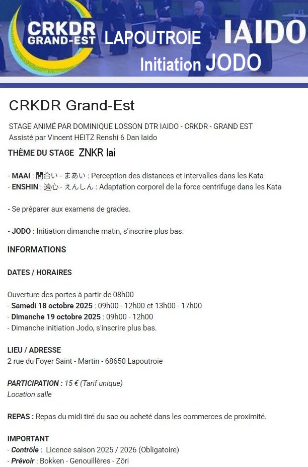 Stage régional Grand Est de iaido animé par Dominique LOSSON Renshi 7e dan, directeur technique régional, assisté par Vincent HEITZ Renshi 6e dan.